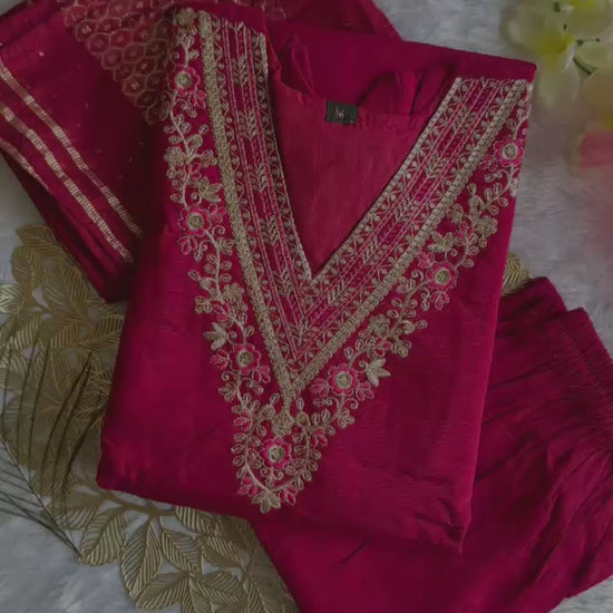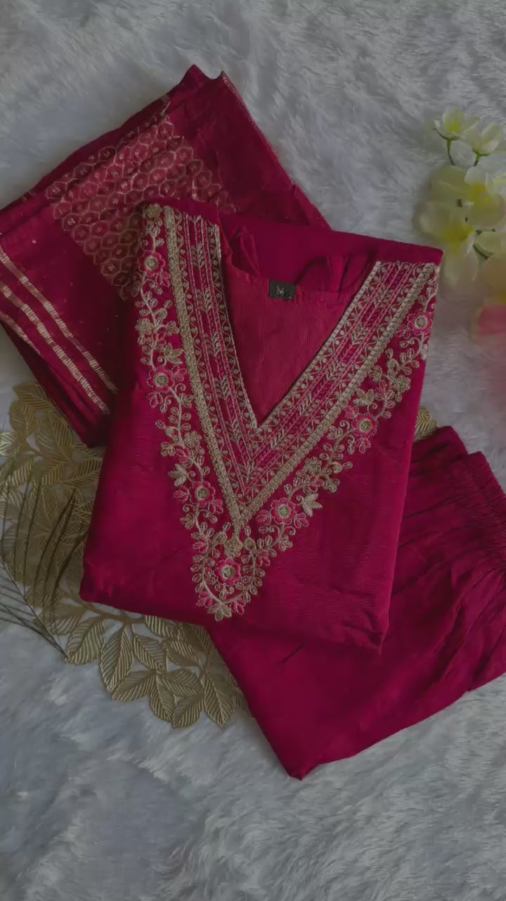 Cherry Red Roman Silk Kurti Set | Embroidered Designer Wear with Sequinned Dupatta