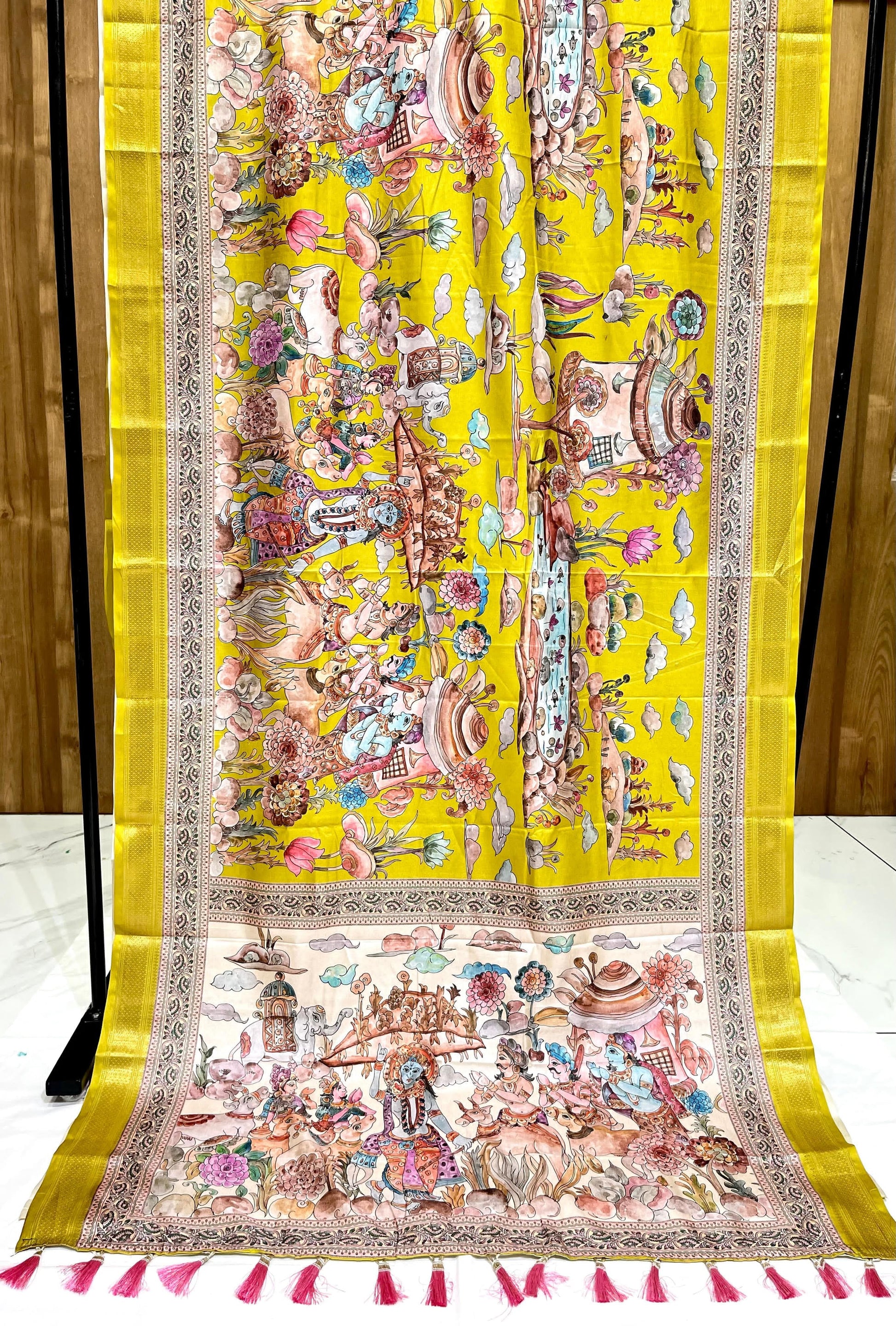Each saree in this set is crafted from elegant Manipuri Silk, known for its soft texture and subtle sheen. The body is adorned with vibrant, digitally printed Madhubani figures, showcasing the ancient storytelling art form in stunning detail. This folk narrative is beautifully framed by a luxurious zari-woven border on both sides, adding a touch of regal grandeur. The rich, digitally printed pallu continues the Madhubani story, creating a cohesive and visually captivating ensemble. Each saree comes with a matching printed running blouse piece.