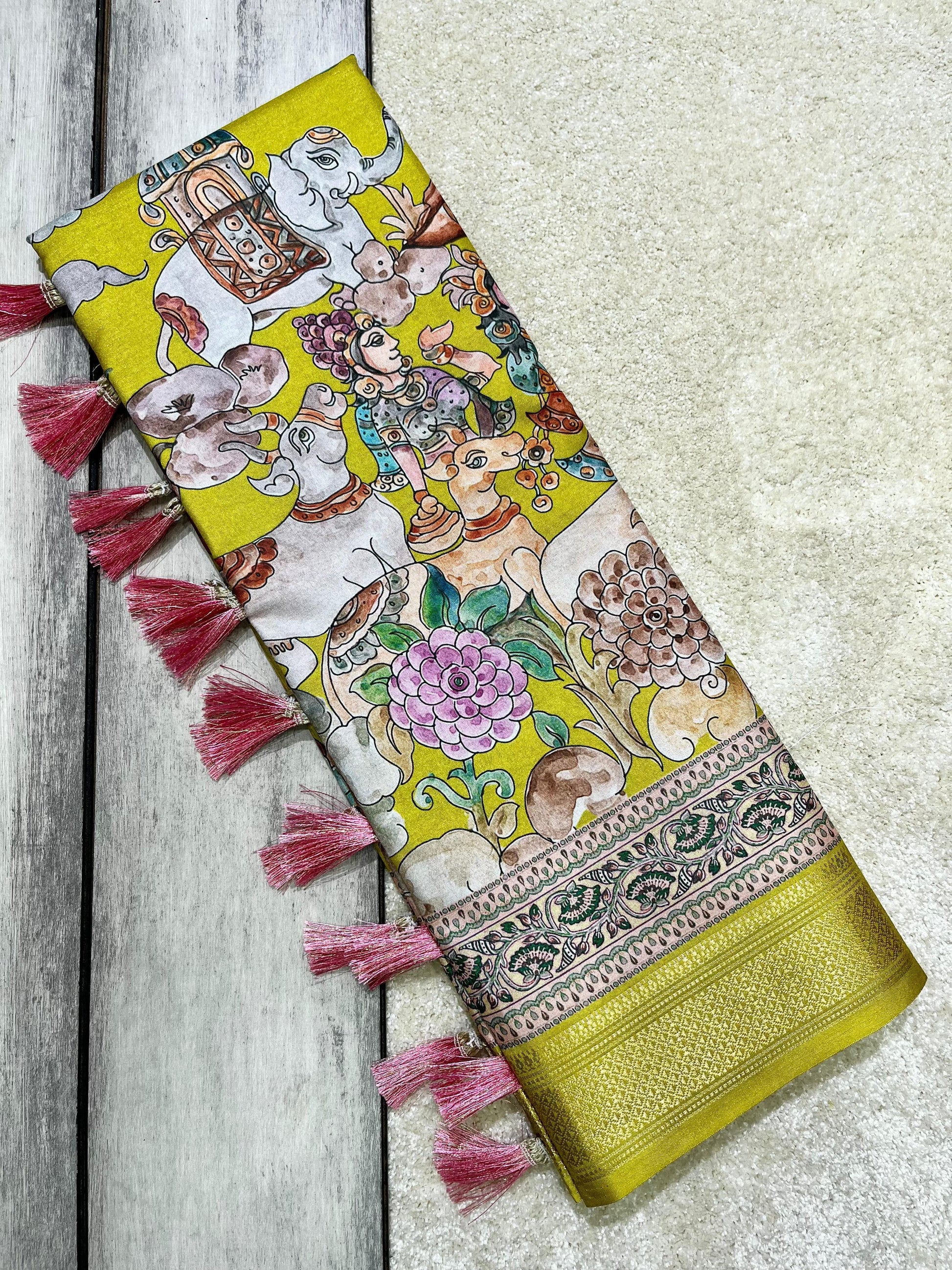 · Artistic Narrative: Rich, digitally printed pallu that continues the beautiful Madhubani storytelling theme.