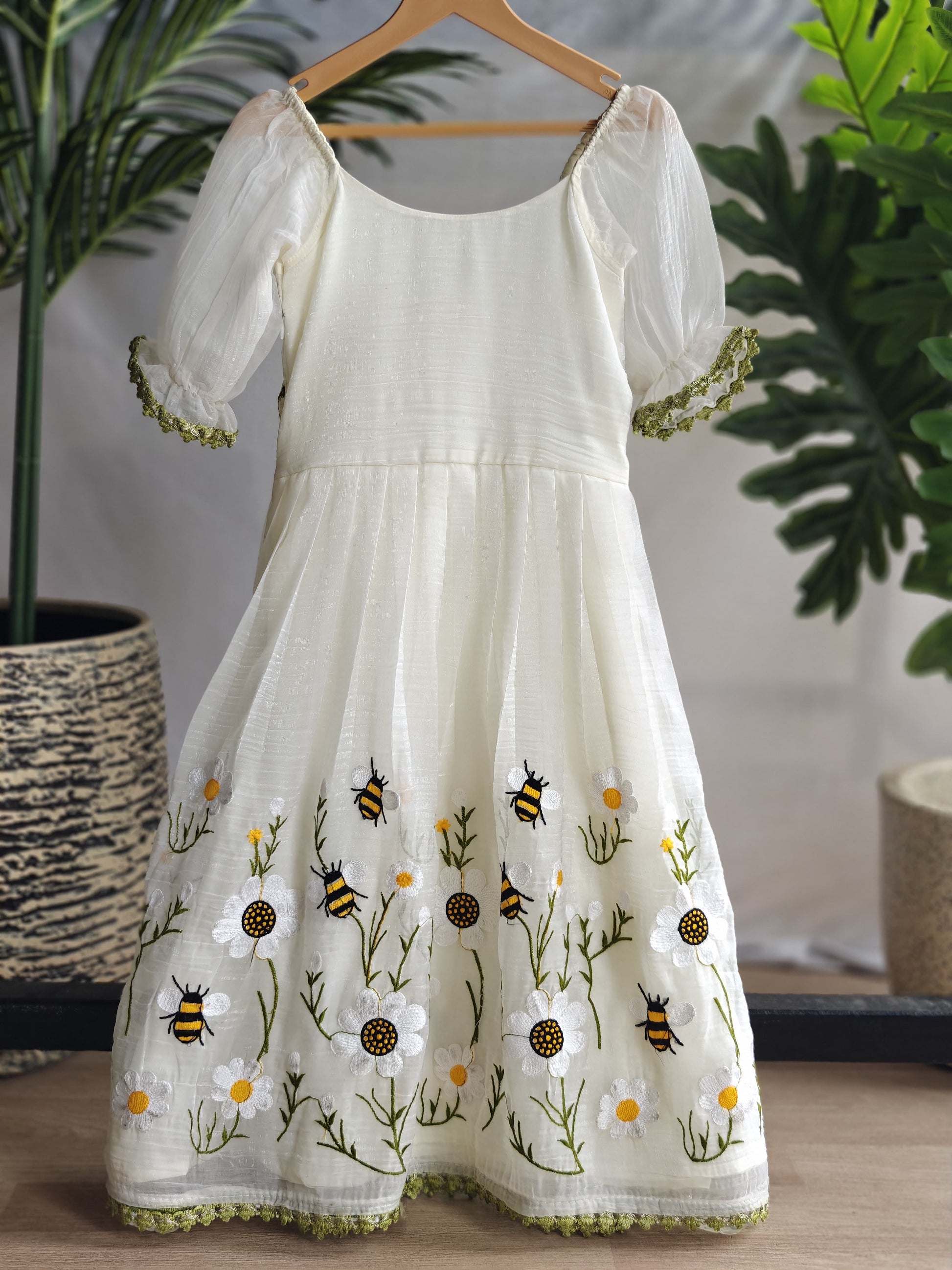 Honeybee Off-White Flared Dress for Girls | Honeybee Embroidery with Puff Sleeves | Crush Organza Dress for Special Occasions