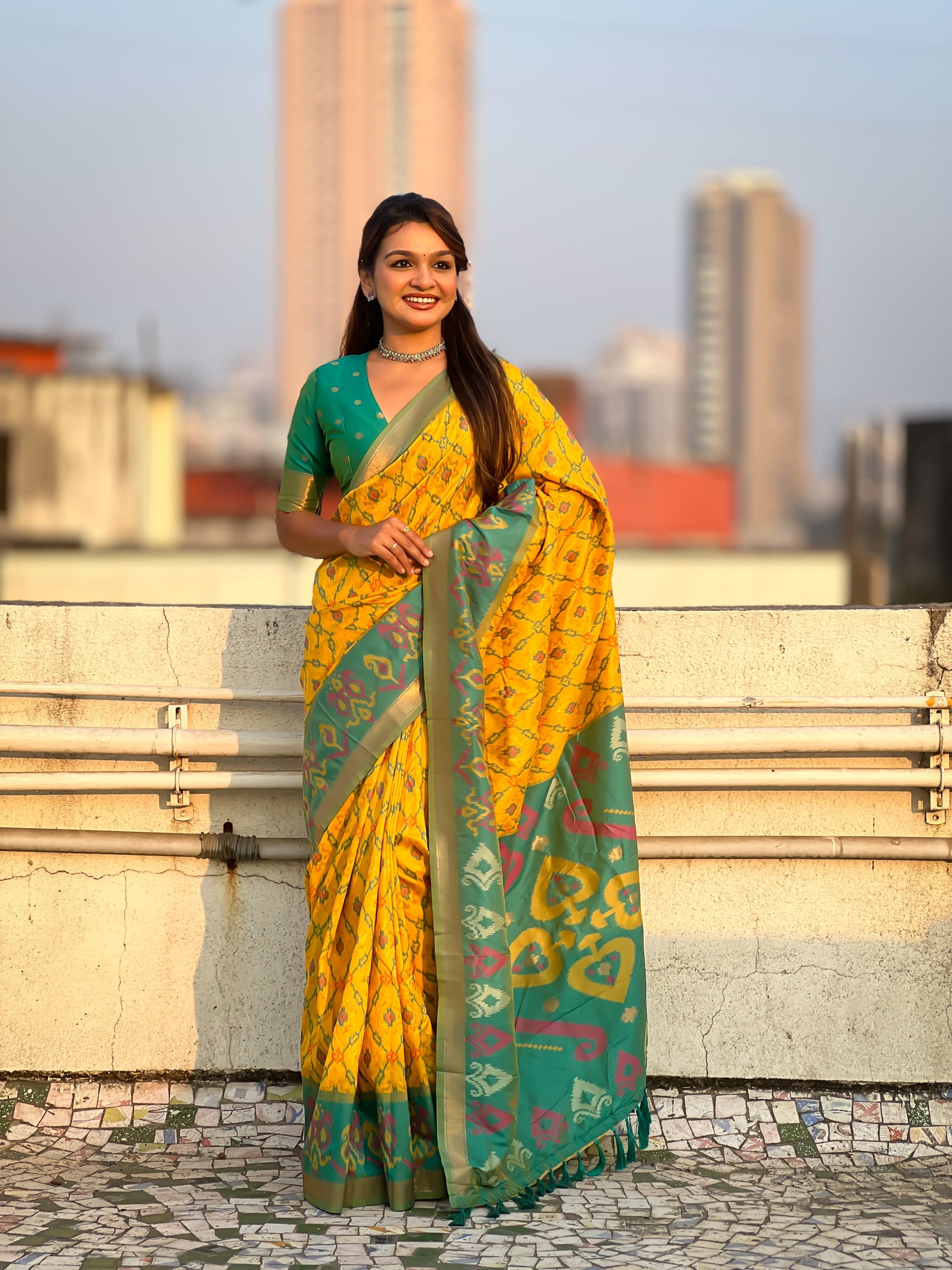 · Fabric: Premium Patola Silk, renowned for its lightweight feel, rich texture, and elegant drape.