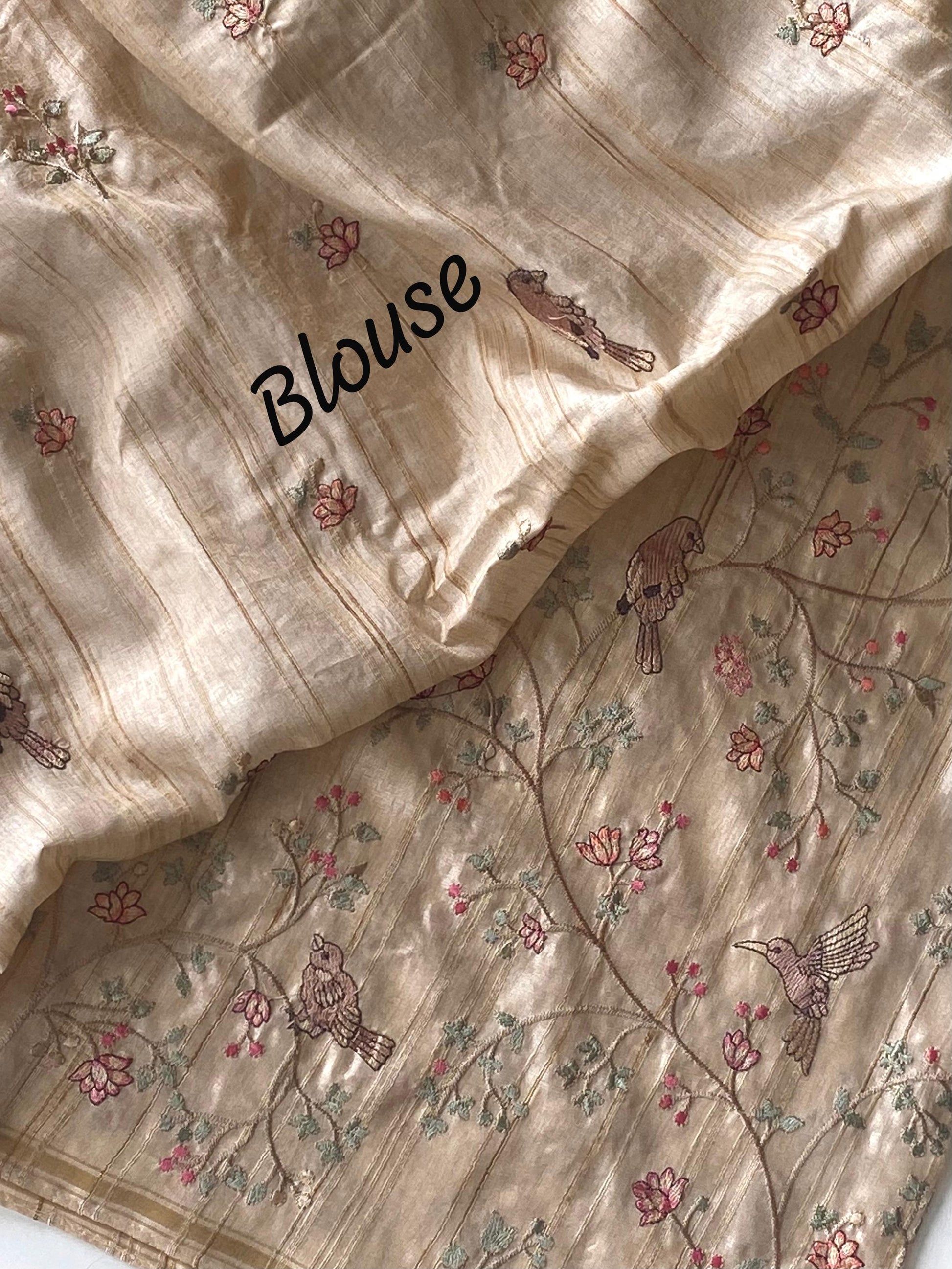 Embrace timeless elegance with our DeviKA catalogue—a celebration of heritage craftsmanship and contemporary design. This exquisite pure loom Tussar saree features all-over designer embroidery patterns, inspired by traditional handloom artistry. Adorned with elegant tassels and a gleaming gold zari border, this saree is a perfect blend of luxury and tradition.