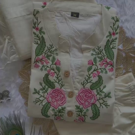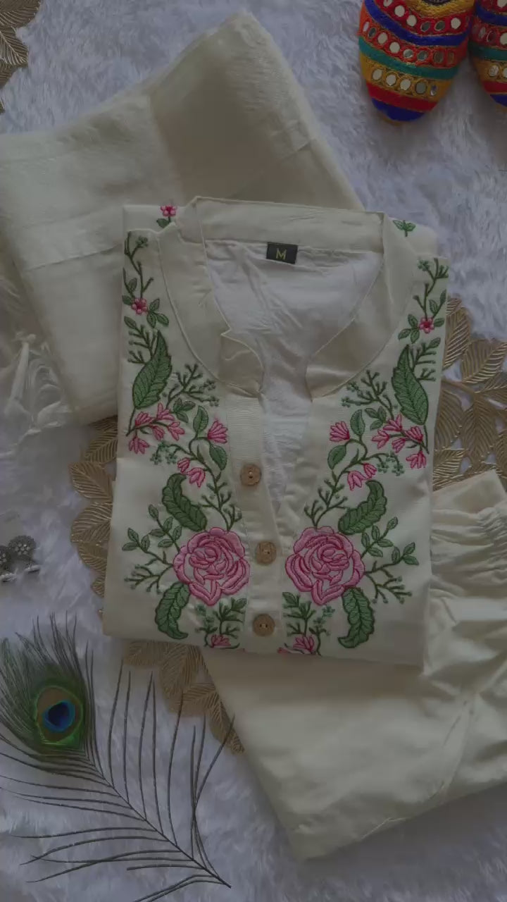Crafted from premium Khadi Cotton, this set features beautiful intricate embroidery on the kurti, adding a touch of sophistication to the minimalist white palette. The matching khadi pent offers comfort and effortless style, while the dupatta showcases a unique zig-zag border design, measuring 2.25 meters for graceful draping. The pure white color makes this ensemble versatile enough for both daytime events and evening gatherings.