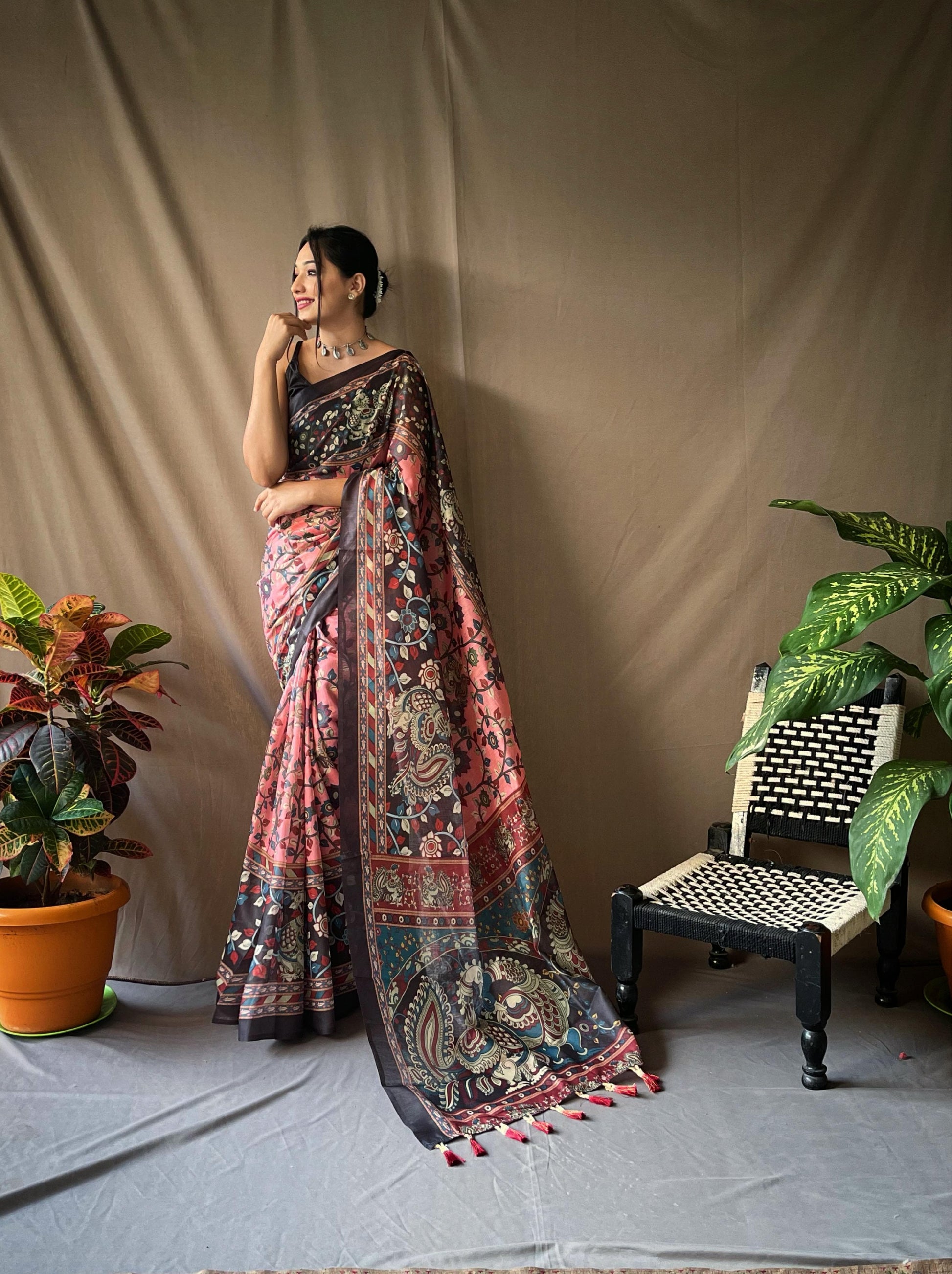 Embrace the artistry of traditional Indian craftsmanship with our Cotton Kalamkari 2 Saree. Made from 100% pure cotton, this saree features authentic Kalamkari prints that showcase intricate storytelling through art. The contrast pallu, adorned with elegant tassels, adds a touch of modernity to the classic design. Paired with a contrasting blouse, this ensemble is perfect for casual outings, cultural events, or festive occasions. Comfortable, breathable, and stylish, this saree is a must-have for every ethnic wardrobe.