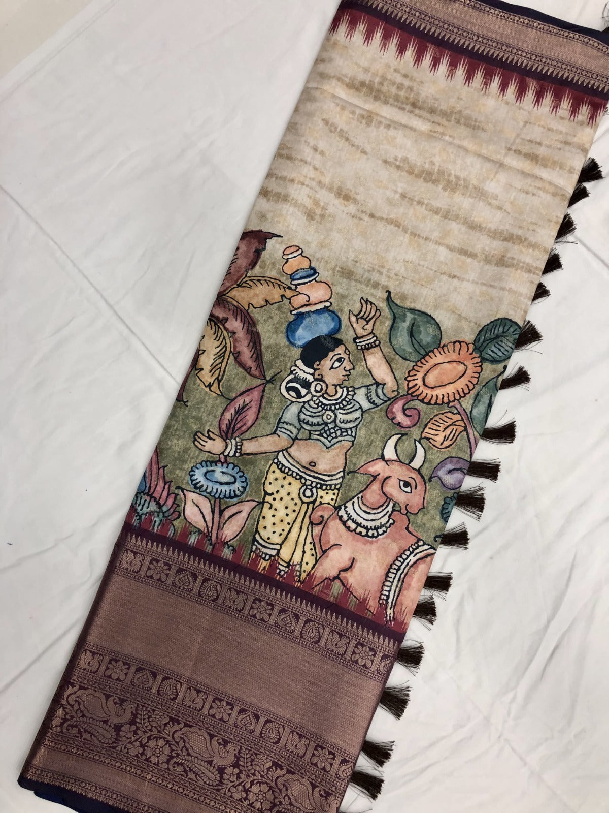 Vidya | Premium Soft Banarasi Silk Saree with Kalamkari Print & Zari Work
